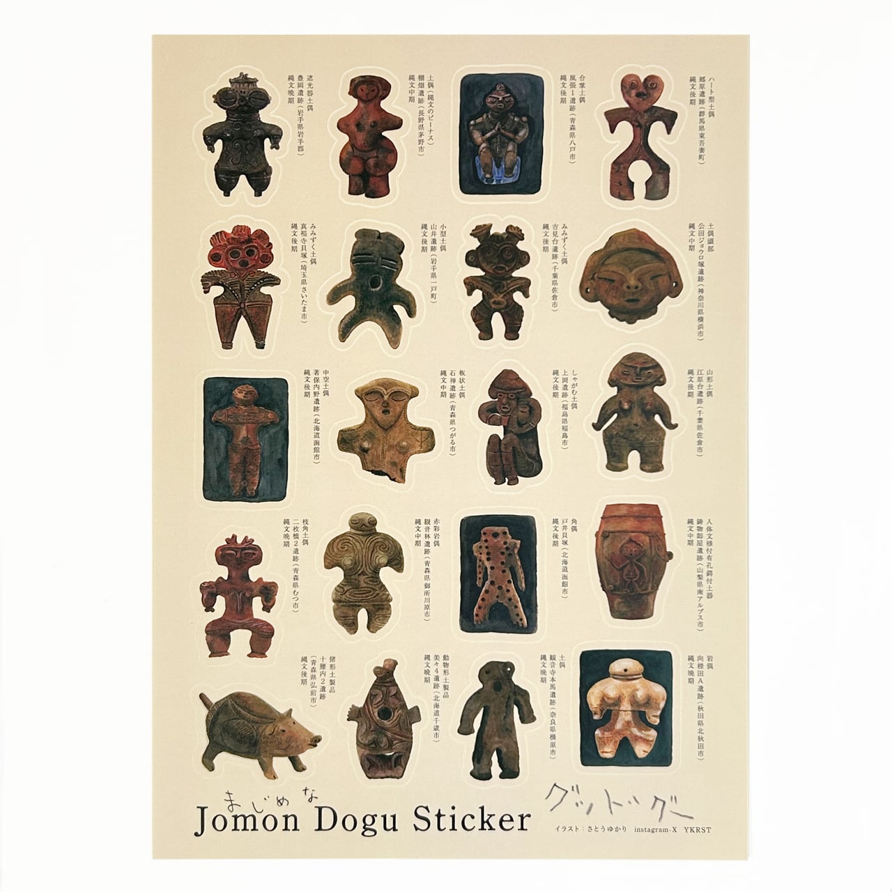 さとうゆかりが水彩で描いた土偶たちをシールにしました。